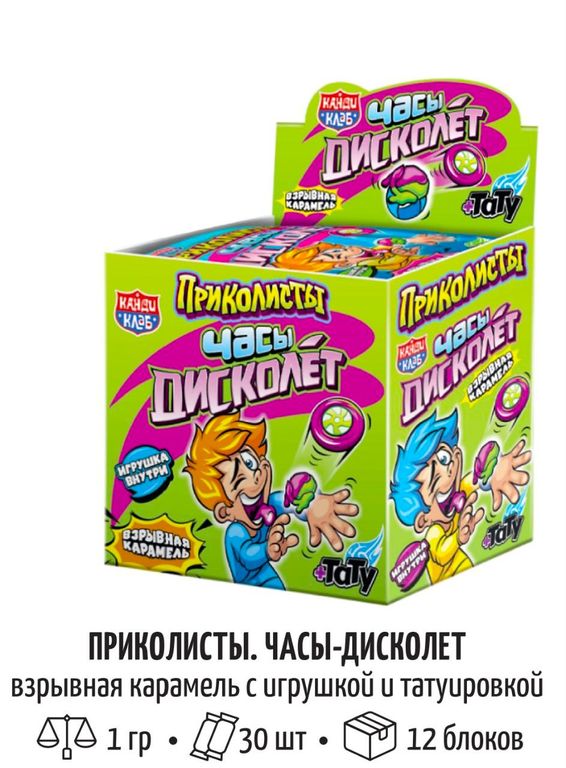 В наличии Взрывная карамель с игрушкой и татуировкой «Приколисты. Часы-дисколёт» 1г*30шт*12 блоков В наличии